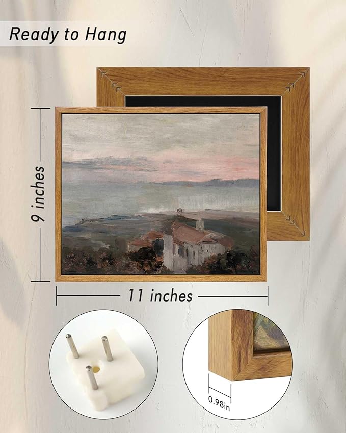 - READY TO HANG: Measuring 22.5X27.5cm, this framed canvas art wall decor is designed for convenience. It comes with two hooks, making it effortless to hang. Before nailing the hook onto your wall, please refer to the installation instruction image provided. Please note that this item is handmade, so a size error of about 0.2 inches may occur.