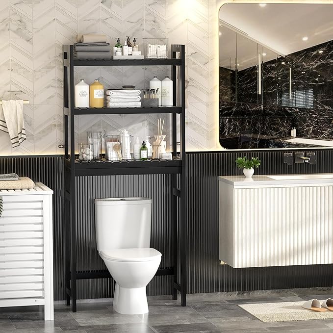 - BATHROOM SHELF SPACE SAVING - The perfect pick for small bathrooms, a 3-tier freestanding over-the-toilet storage unit helps keep your toiletries organized without taking up too much floor space, you don't have to bend over to get stuff under the sink anymore. Adjustable bottom bar for toilets of different heights.