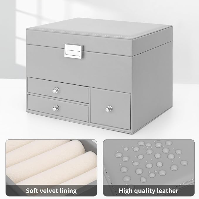 DesignSter Jewelry Organizer Box, 3 Layers Large Jewelry Box with Travel Jewelry Case and Removable Tray, Jewelry Storage Case with Mirror for Necklaces Earrings Rings Bracelets Watches (Gray)