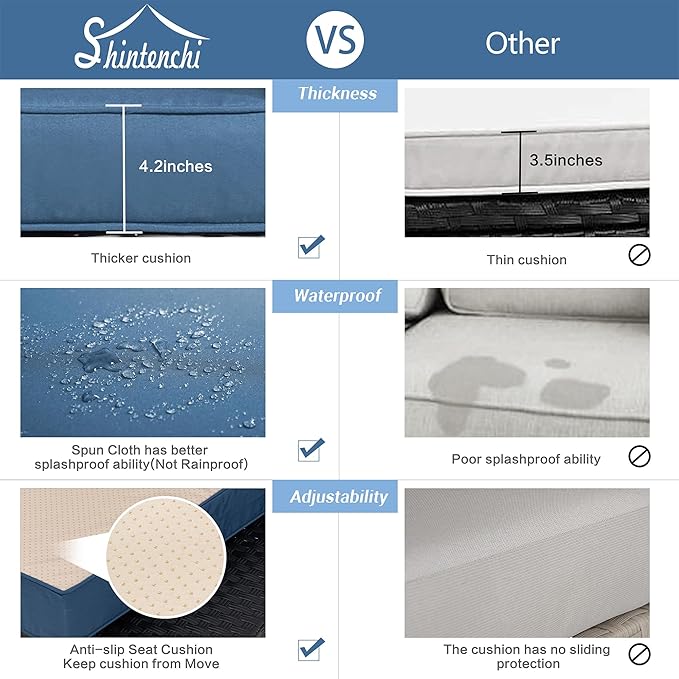 - Sturdy&Durable: Solid metal structure make it super safe to sit in the sofa set. Added bars for the frame enhance the sturdiness and allow the sofa to support heavy people about 300lbs. Adjustable feet make it steady on uneven surfaces. PE Wicker is strong enough to survive inclement weather and guarantee the set has a long service life.Note: cushions are not water-proof;(When you don' t use it, advise you to take cushions inside or buy a cover for longer service time)