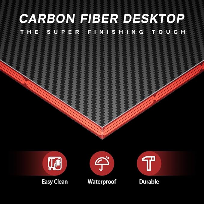 - Super Gaming Style: The amazing carbon fiber material covers the desk, even including the bottom baffle, which makes the whole table full of fabulous gloss and delicate touch. Plus the detail dark red pattern mezzanine and unique z shaped chair legs. Bring you the double enjoyment of vision and touch.