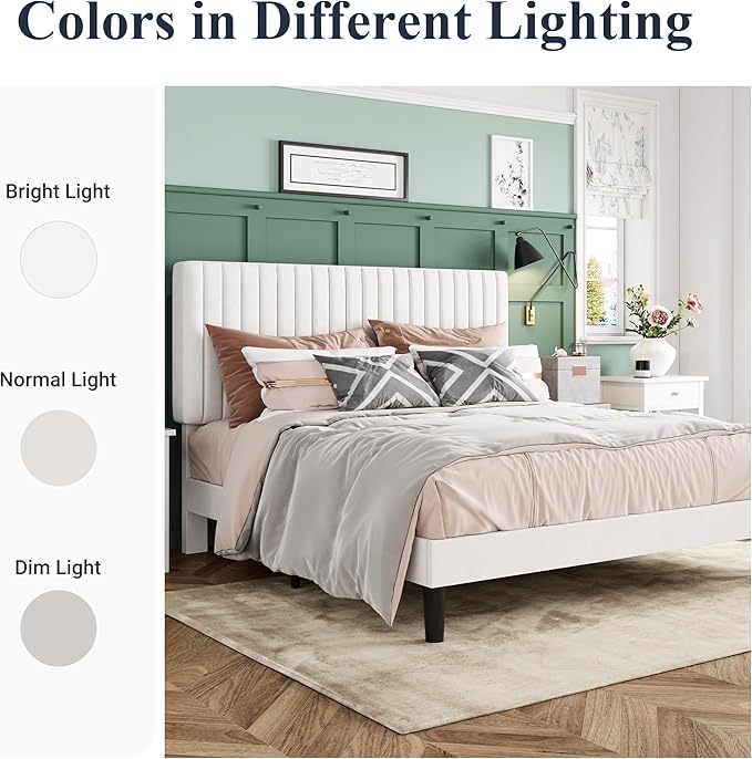 Allewie Queen Bed Frame, Velvet Upholstered Platform Bed with Adjustable Vertical Channel Tufted Headboard, Mattress Foundation with Strong Wooden Slats, Box Spring Optional, Easy Assembly, Off-White