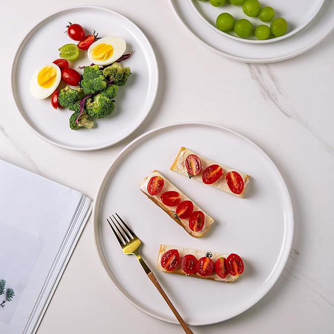 - GOOD SHAPE AND MULTI-PURPOSE: The flat dinnerware set creates a modern and minimalist table setting.The shape is great as it makes. They are easier to handle and hold and they stack really well without taking up much space, stack and nestle nicely in your cupboard or shelves. Our Dinnerware set is microwave, dishwasher and freezer safe. Perfect for every day use, indoors or out, ideal for any kitchen.