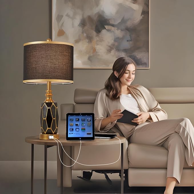 - Functions and Features:The bottom of the lamp has a USB and USB-C charging ports, convenient to charge smart devices, whether it is a bedside lamp or placed in the bedroom living room is very convenient, followed by a full range of touch switch. The magic of this lamp is that you can turn the light on or off just by touching the gold part (except for the gold part of the lampshade), and the lampshade can be adjusted to choose the Angle you want to shine at.