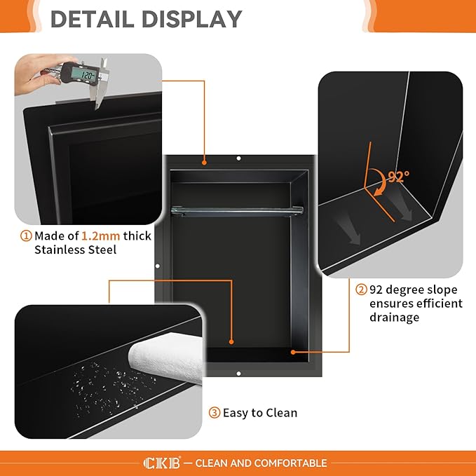 - [Material] This built-in shelf is crafted from high-quality 304 stainless steel. It has a sturdy 1.2mm thickness that stands the test of time ensuring long-lasting use. It is very suitable for the environment of the bathroom.