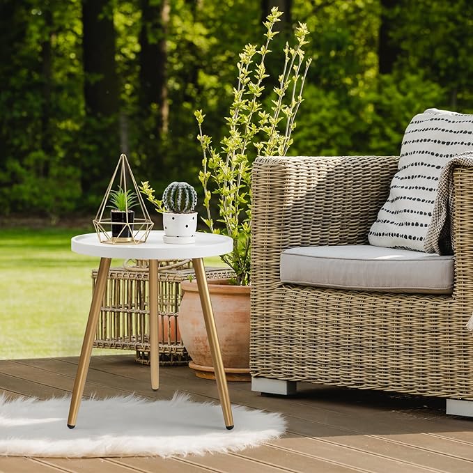 danpinera Round Side Table, Metal Legged Accent Table with Wooden Tray, Small Round End Table for Living Room, Bedroom, Nursery, White & Gold