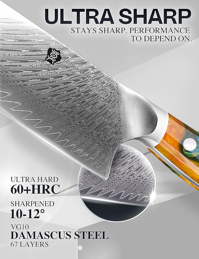 - 【Professional Damascus Chef Knife】WILDMOK chef knife use high quality Japanese 67 layers damascus steel, professional 8 inch chef knives and best gifts for chefs kitchen knives. The Rockwell hardness of the cutting core is 60+. The cutting edge is 10-12 degrees, making it useful for good edge strength while maintaining excellent sharpness.