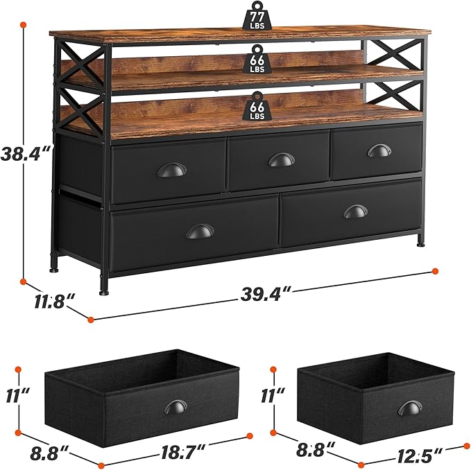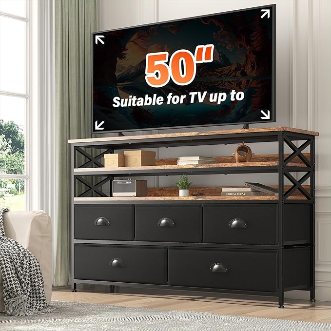 Black Dresser TV Stand for 50" TV, Sturdy Dresser for Bedroom with 3 Wood Open Shelves and 5 Fabric Drawers, Chest of Drawers Storage Dressers for Entryway, Closet, 11.8" D x 39.4" W x 38.4" H