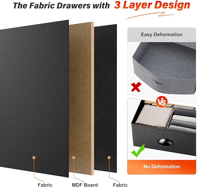 - 【More Secure Dresser】Made from sturdy metal frame and wood board to offer stable support and ensure years of use; The dressers & chest of drawers made of high-quality fabric and durable handle. Equipped with anti-tip kits to prevent the dresser from dumping, which is friendly for you. 4 adjustable foot can prevent shaking in uneven places and protect the floor from scratches. The double X design on the side provides double stable performance and is very beautiful and fashionable.