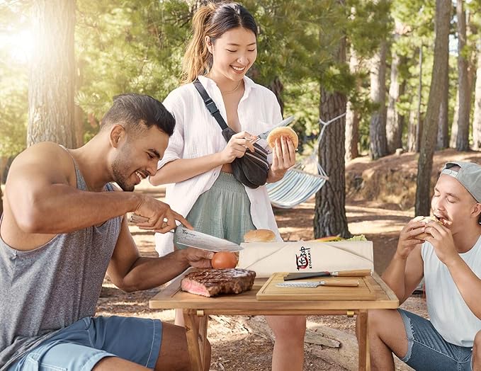 - A PRACTICAL SET: The Japanese style chef knife set includes an 8" chef knife, 8" slicing knife, 8" bread knife, 6" boning knife, 6" utility knife, 5" santoku knife, sharpening steel, and a knife roll bag. Whether you're a professional chef on the go, a culinary student, on vacation, or heading out for an extreme camping trip, this versatile set is the perfect solution for carrying your kitchen knives