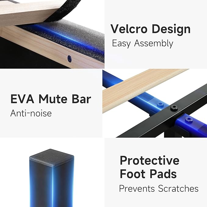 - 【Solid and noiseless 】The bed frame consists of a heavy metal frame and 12 solid wood slats, A pull bar in the middle of the headboard makes the bed frame more stable, Eight support points can support up to 1,000 pounds, effectively extending the life of the bed frame. Solid wood slats with Velcro and EVA mute bar, effectively avoid the noise caused by the friction between wood and metal frame, will not squeak, ensure your sleep quality!