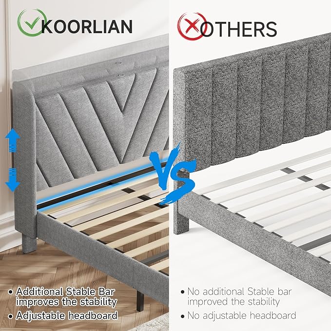 - 【Built-in TYPE C&USB charging port】Koorlian bed frame with adjustable headboard is equipped with TYPE C&USB port, compatible with Android&ios mobile phones, so that your mobile phone, computer, desk lamp and other electronic devices are always online, Personalized design is convenient for you to lie in bed anytime and anywhere charging, solving the problem that the socket is too far. At the same time more convenient for your life!