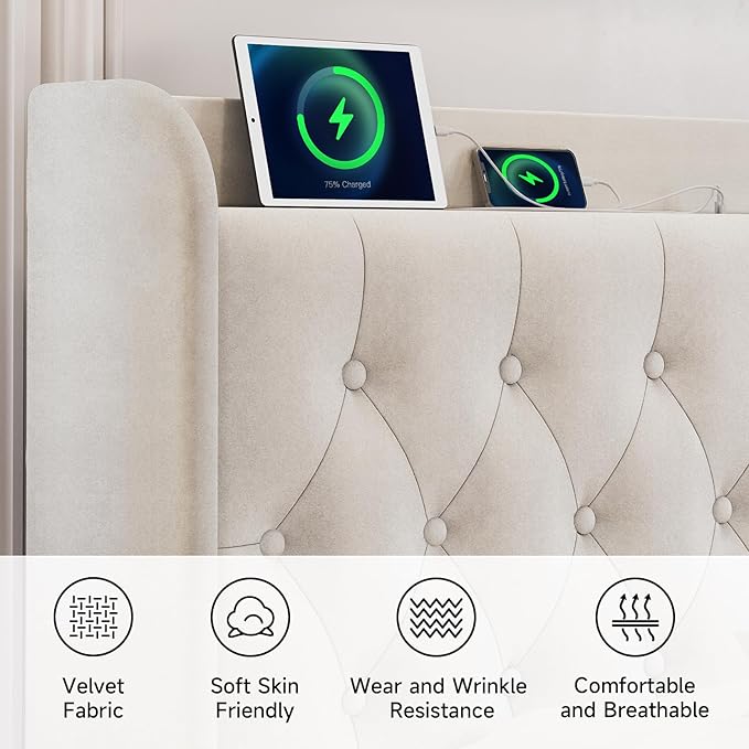 koorlian Queen Bed Frame with Headboard, Adjustable Velvet Upholstered Bed Frame with Type-C&USB Ports, Wingback Storage Headboard, Solid Wood Slats Support, No Box Spring Needed, Noiseless, Beige