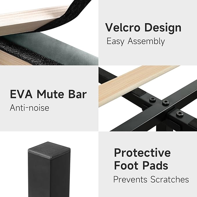 - 【Solid and noiseless 】The bed frame consists of a heavy metal frame and 12 solid wood slats, A pull bar in the middle of the headboard makes the bed frame more stable, Eight support points can support up to 1,000 pounds, effectively extending the life of the bed frame. Solid wood slats with Velcro and EVA mute bar, effectively avoid the noise caused by the friction between wood and metal frame, will not squeak, ensure your sleep quality!