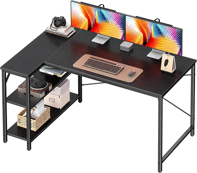 Huuger L Shaped Desk, 47 Inches Computer Desk with Reversible Storage Shelves, Gaming Corner Home Office Writing Study with Metal Frame, Black
