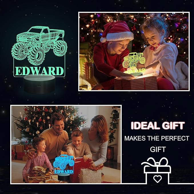- Perfect Gift: 3D illusion monster truck shade night light would be perfect party supplies, kids toys, toddler toys, housewarming gifts, graduation gifts, birthday gifts,Thanksgiving gifts, Christmas gifts for kids, baby, toddlers,child, friends. Ideal home decor, bedroom decor, kids room decor, office decor, etc.