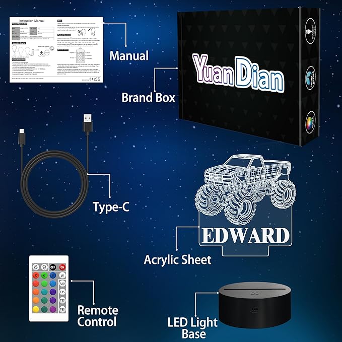 - Creative 3D Visual Effect: This is an 3D illusion lamps can show up the monster truck when it light up, with an optical acrylic flat board with engraving can give you amazing 3D visual effect.3D is just visual, the light itself is flat.It's bound to amaze and impress your kids and guests. It is a unique birthday, Christmas or Easter gifts for kid or friends, monster truck decorations for home.