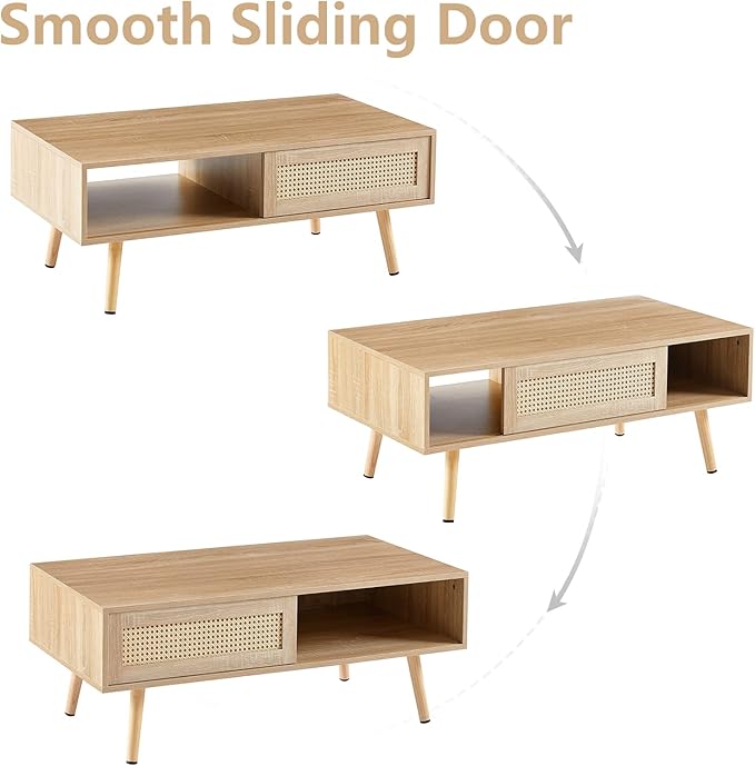 Rattan Coffee Table, 40.3" Mid Century Modern Coffee Table with Storage, Farmhouse Rectangle Wooden Accent Center Sofa Table with Rattan Sliding Door, for Living Room Christmas-Natural