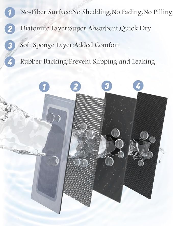 - Innovative Soft Diatomaceous Earth Bath Mat: Experience the perfect blend of comfort, functionality, and innovation with our luxury bath rug. Bathroom floor mat features a smooth leather-like surface for easy maintenance, a cushioning sponge layer for added comfort, a super absorbent and quick-drying soft diatomaceous earth layer, and a durable rubber backing for added stability.