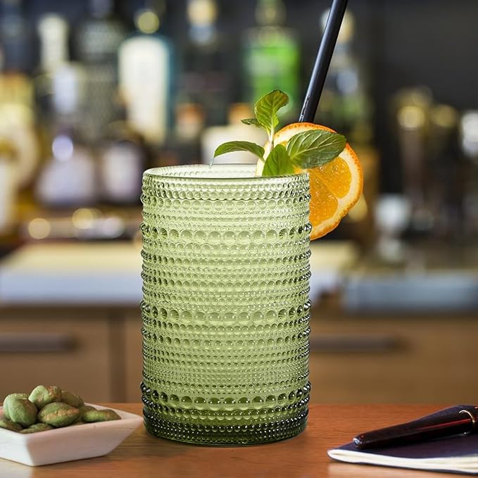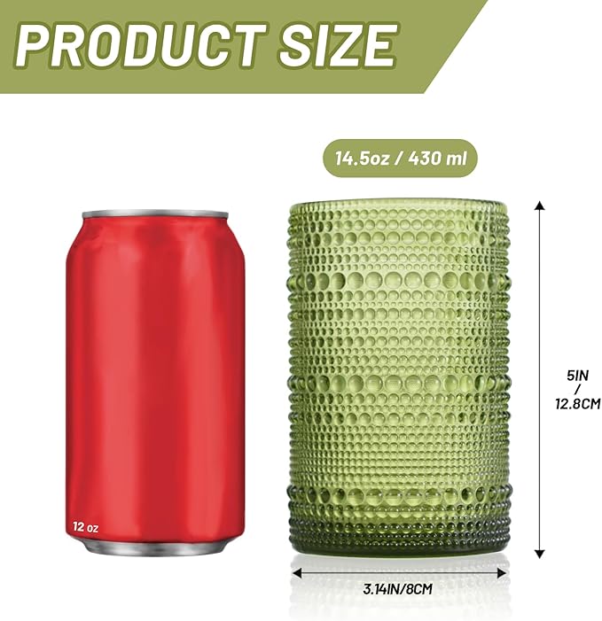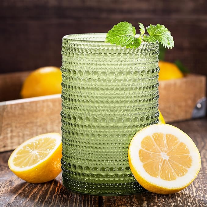 Hobnail Drinking Glasses Set of 6, Vintage Colored Glassware 14.5oz, Tall Beverage Glass Cups for Water, Juice, Cocktail (Green)