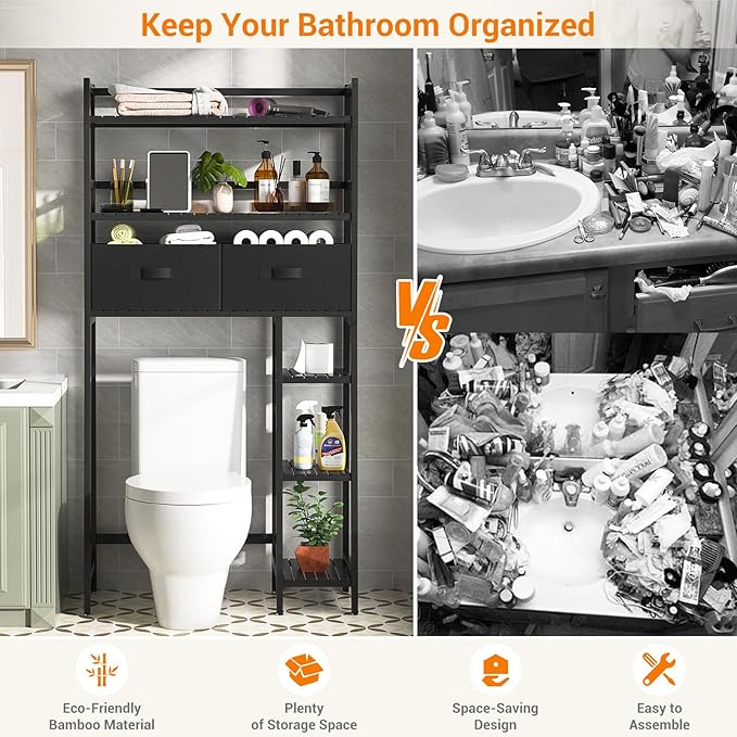 - MASSIVE STORAGE SPACE: This freestanding over toilet storage unit features 2 spacious open shelves for easy access and 2 fabric drawers for privacy. Tiered design gives you plenty of room to place and organize toiletries, tissues, towels, potted plants, and other bathroom essentials. The toilet paper holder stand can be installed on the left or right side based on your needs. Holds approx 18 rolls of toilet paper.