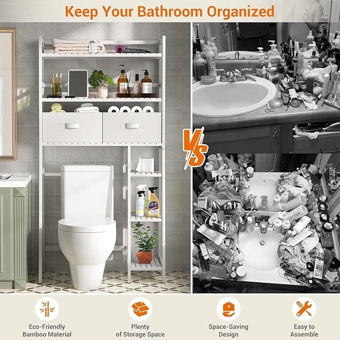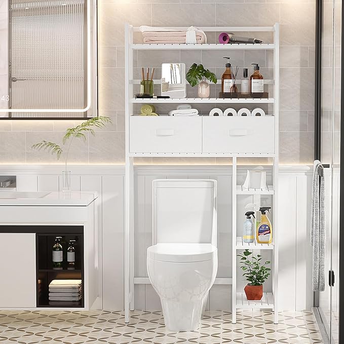 - MASSIVE STORAGE SPACE: This freestanding over toilet storage unit features 2 spacious open shelves for easy access and 2 fabric drawers for privacy. Tiered design gives you plenty of room to place and organize toiletries, tissues, towels, potted plants, and other bathroom essentials. The toilet paper holder stand can be installed on the left or right side based on your needs. Holds approx 18 rolls of toilet paper.