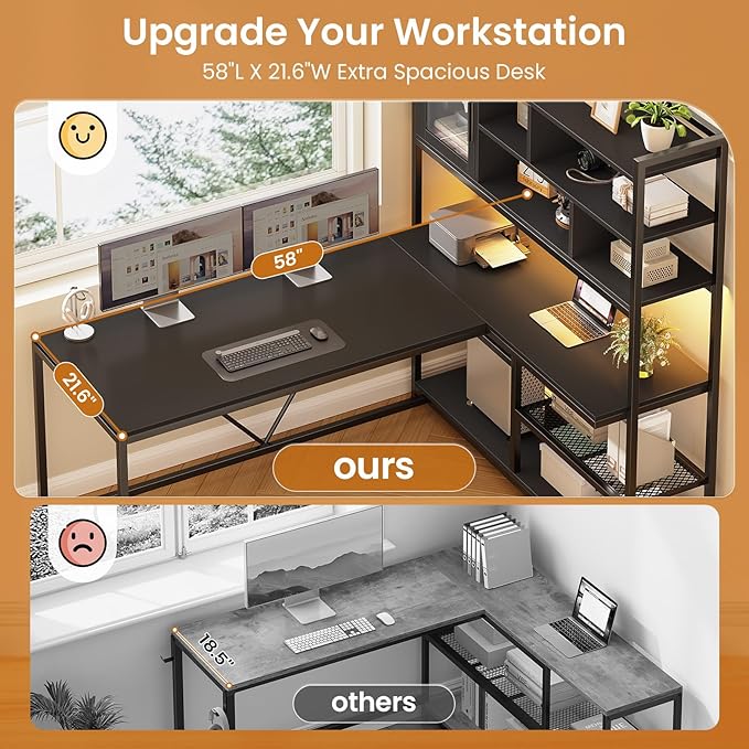 - 【Reversible Desk】With reversible design, this home office desk can be installed in 2 directions according to your needs. The L shaped computer desk could hold two desktop computers and one notebook computer. The desktop size is 58"L*21.6"W. The simple design and multi-function storage to meet all needs. An ideal desk for small rooms or limited spaces to create excellent home office space.