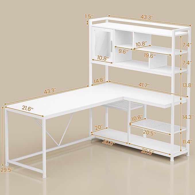 - 【Large Storage Space】L shaped desk with 7 tiers open shelves, 1 glass storage cabinet, This 61" tall bookshelf has 7 shelves , which offer enough space to store your daily items, books, files, printer stand, CPU stand or game figure, collect trophies, and souvenirs.