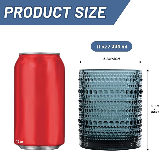- SIZE AND CAPACITY: Each glass is 3.9 inches tall, 3.2 inches in diameter; Each glass weights about 0.75lbs, easily holds 11 fl oz liquid