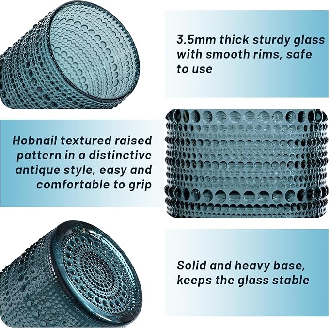 Hobnail Drinking Glasses Set of 6, Vintage Colored Glassware 11oz, Beverage Glass Cups for Water, Juice, Cocktail (Blue)