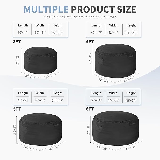 - Memory Foam Filler: Homguava bean bag chair with filling comes with a separate condensed liner package. Once you receive it, please do not leave it for too long and open the package ASAP. After opening, please flip the whole beanbag chair up and roll it a few times, then leave it for about 48 hours, it will expand perfectly.The bean bag is full-filled with memory foams, which has a high resilience, bearing more and increasing the comfort of sitting.