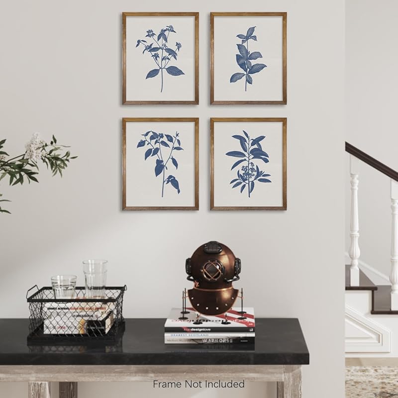 French Country Minimalist Plant Wall Decor - Blue Botanical Sketch Drawing Etching Wall Art - Farmhouse Leaf Poster Kitchen - Beige Neutral Vintage Flower Print Picture - Antique Minimal Blue Floral