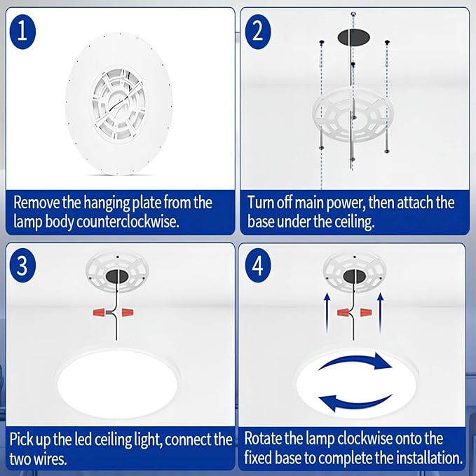 - Easy Installation: Only 3 easy steps to install the flush mount ceiling light. β Turn off main power, then attach the base under the ceiling.(This ceiling light is large, itβs not suitable to be directly fixed on the wiring box base. It's needs to be fixed directly on the ceiling for safety, Please check in advance whether it is suitable for installation) β‘ Pick up the led ceiling light, and connect the two wires. β’ Rotate the ceiling light to the mounting base. Simple and safe. The installation of the led ceiling lamp can be done in a few minutes. (All accessories needed and instructions are included in the package)