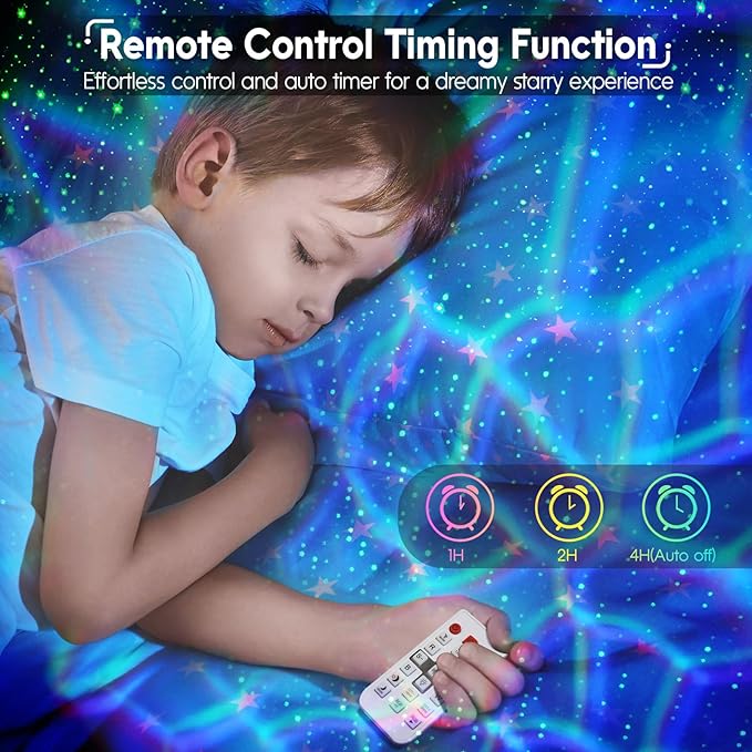 - Remote Control & Auto-Off Timer: The astronaut light projector comes with a remote control that allows you to freely turn ON/OFF the galaxy lights, starlight, or moonlight, change lighting modes, adjust brightness, and speed. The space projector has a timer function that you can set to turn off after 1 or 2 hours, or 6 hours auto-off. No need to worry about leaving it on when trying to fall asleep. Additionally, the separate dimmable moon night light allows you to have it stay on all night
