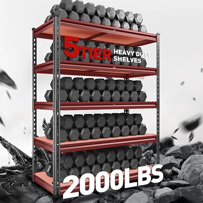 - 【2000LBS Capacity Garage Storage Shelves Heavy Duty】The heavy duty shelving has thickened steel legs. Made of high-quality metal frame+high-quality thicker boards,so each shelf can hold up to 400 lbs, with a total bearing capacity of 2000 lbs, which makes 5 tier garage shelving unit more stable, solid and more stuff can be stored