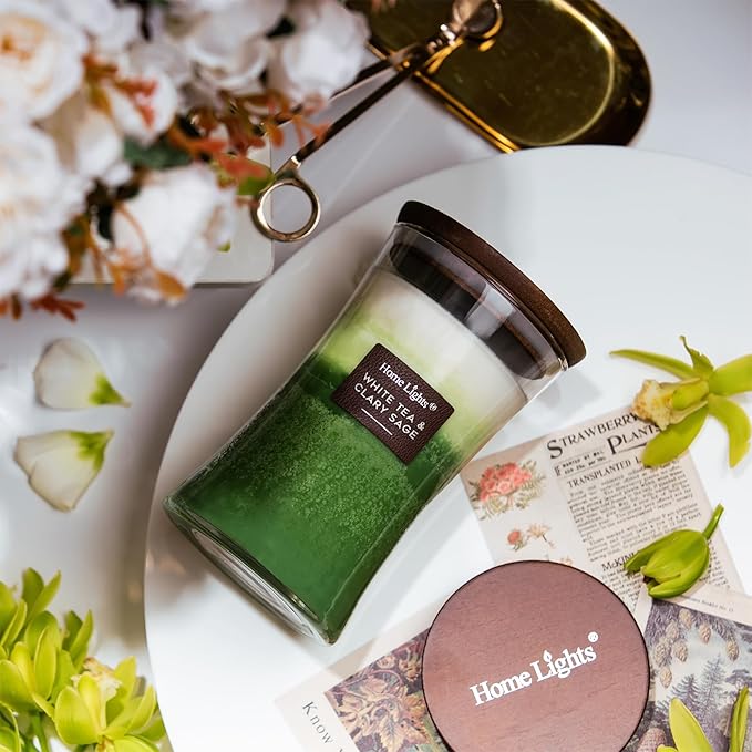 HomeLights 3-Layer Candles for Home Scented, 21.52 OZ Natural Soy Wax Scented Candles Burns Up to 100 Hours, Large Jar, White Tea & Clary Sage