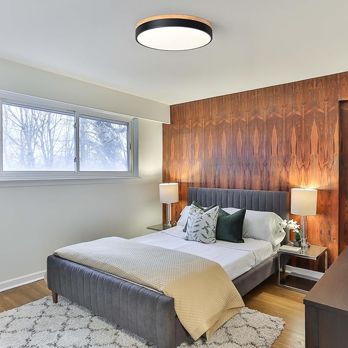 - Brightness Dimmable and Five Light Colors Selectable: The wood ceiling light can be adjusted in brightness when it is used with a dimmable switch (NOT Included). The led ceiling light can be adjustable in five color temperatures (2700 K to 6000 K) by the switch around the built-in LED chips, and you can find the perfect light for your space