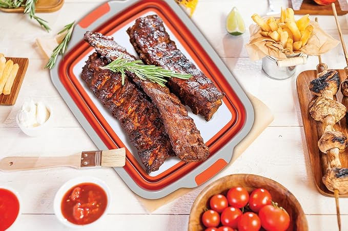 - IDEAL FOR INDOOR AND OUTDOOR USE: Ideal for picnics, camping, or BBQs. Fits over most sinks to prevent spills. Available in orange and black. Dimensions: Fully Expanded: 19"x14"x4.5"; Half Expanded: 19"x14"x2.5"; Fully Collapsed: 19"x14"x1.25".