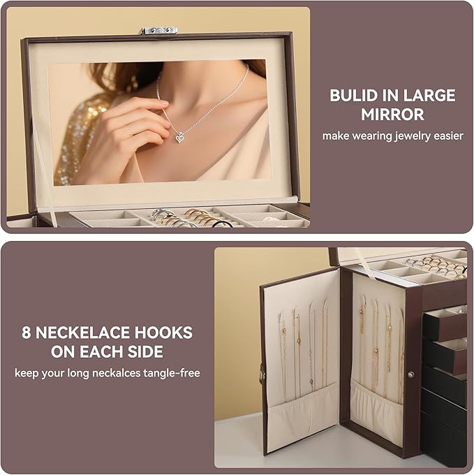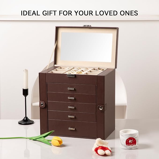 Frebeauty Large Jewelry Box,6-Tier PU Leather Jewelry Organizer,Multi-functional Storage Case with Mirror,Accessories Holder with 5 Drawers for Necklace Bracelets Watches(Dark Brown)