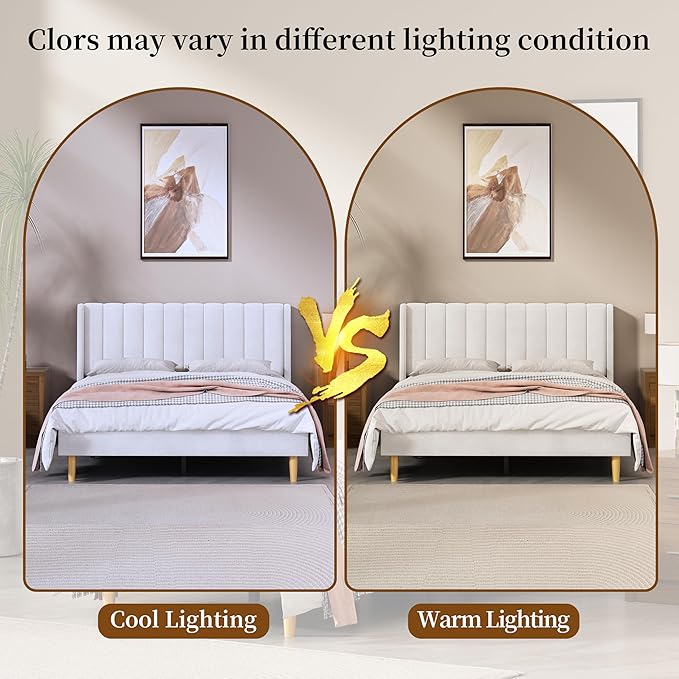 Queen Size Upholstered Platform Bed Frame with Modern Wingback & Vertical Panel Headboard, Velvet Fabric, Wooden Legs & Slats Support, No Box Spring Needed, Noise-Free & Easy Assembly, Cream