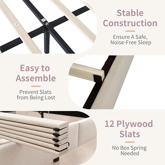 - Noise-Free: The wooden slats of this beige queen size bed frame come with magic tapes for quick and silent assembly, complemented by EVA soundproof pads for a peaceful sleep. Even if you toss and turn frequently, you won't have to worry about creaking noises disrupting your sleep