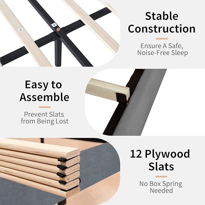 - Robust Construction: This full platform bed frame with headboard features a sturdy metal frame with center support legs and 12 straight slats, supporting up to 800 lbs without the need for a box spring, thus saving you time and effort