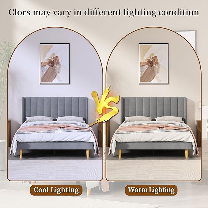 Full Size Upholstered Platform Bed Frame with Modern Wingback & Vertical Panel Headboard, Velvet Fabric, Wooden Legs & Slats Support, No Box Spring Needed, Noise-Free & Easy Assembly, Grey
