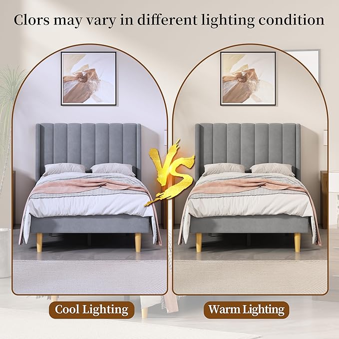 Twin Size Upholstered Platform Bed Frame with Modern Wingback & Vertical Panel Headboard, Velvet Fabric, Wooden Legs & Slats Support, No Box Spring Needed, Noise-Free & Easy Assembly, Grey