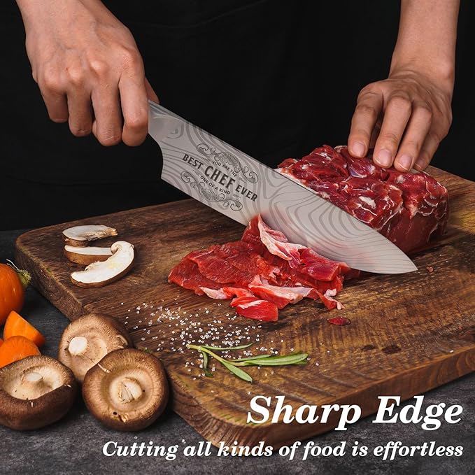 - Cool Christmas Gift for Men:This premium kitchen gift set, engraved 'BEST CHEF EVER,' comes in a luxurious gift box. Even in your absence, every time your friends coworkers wields this chef's knife, he'll be reminded of you. The laser-engraved words are long-lasting and won't fade, safe for cooking. This kitchen knife is the perfect modern men gift for father day, Christmas, birthdays, or retirement, ideal for gifting to men women who has everything