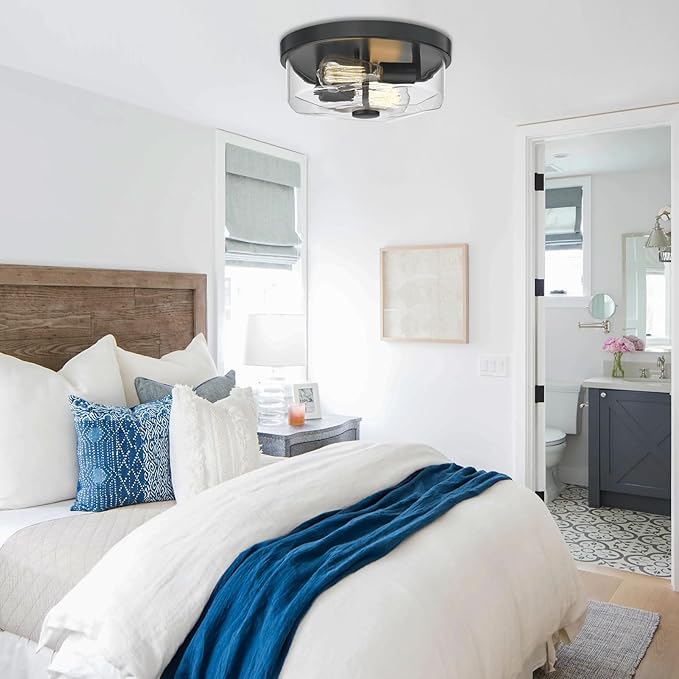 Flush Mount Ceiling Light with Clear Glass Shade, 2-Light Indoor Outdoor Farmhouse Lighting Flush Mount Lights for Kitchen Bedroom Porch Living Dining Room(Black)