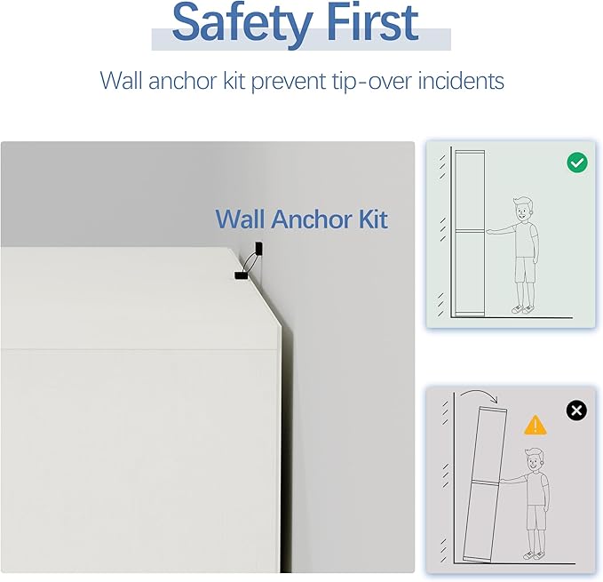 - 【Safety First】With strengthen screws and the tip-over resistance device, lock the cabinet firmly. Refuse to dump accident.