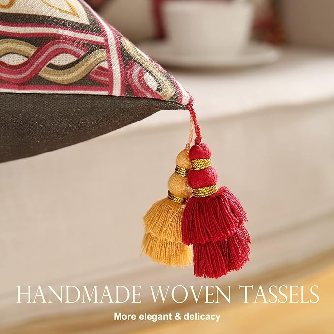 patdrea Designer Throw Pillow Cover 18"x18",Vintage Bird and Floral Pattern Linen Pillows Cover with Red and Yellow Pendant Charms,Square Decorative Pillowcases for Living Room Outdoor,Set of 2