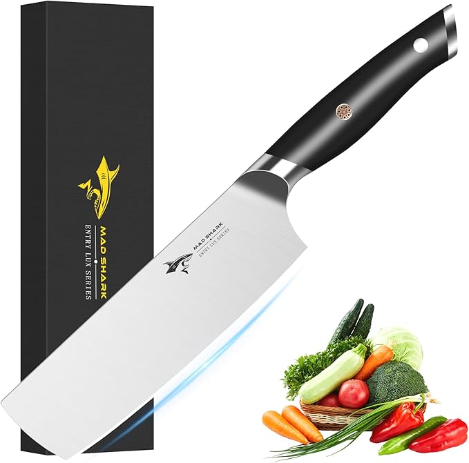 - MULTI-FUNCTIONAL NAKIRI KNIFE – MAD SHARK’s traditional Japanese-style 7-inch chef knife enhances your food prep efficiency, making it ideal for slicing, dicing, chopping, and mincing vegetables with ease. This all-purpose kitchen knife is easy to resharpen, clean, and maintain.