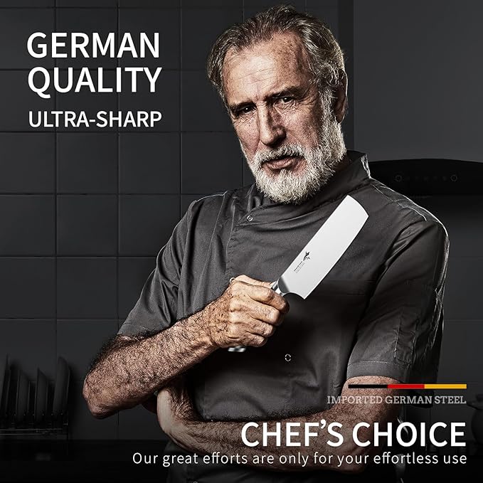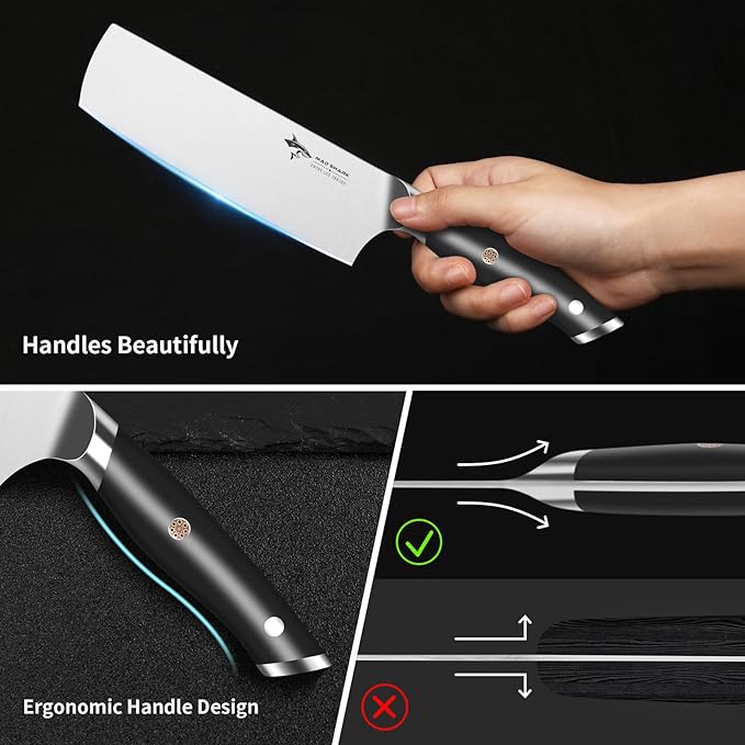 - SUPER SHARP & DURABLE BLADE – Crafted from high-carbon composite steel with 56+ Rockwell Hardness, the MAD SHARK nakiri knife delivers a razor-sharp edge for smooth, effortless cutting. Highly resistant to rust and built to last, it uses the same premium materials as world-renowned cutlery brands.